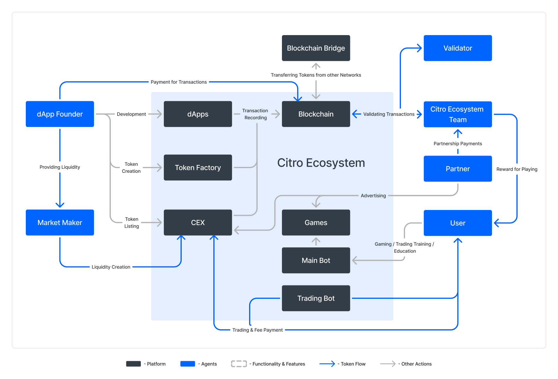 The Citronus ecosystem connects various infrastructure elements, enabling users to interact effortlessly with each other and access different services. The underlying infrastructure makes the ecosystem accessible for beginners, efficient for crypto traders, and simple for dApps developers.