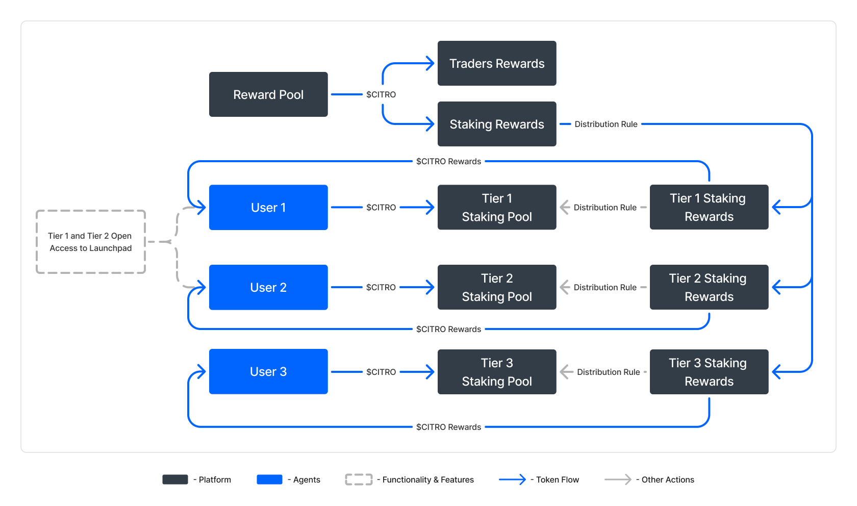 To reward long-term holders who have shown loyalty and made a significant contribution to the development of the product, the platform has created a special Rewards pool. In order to become a participant in the rewards program, a user must lock CITRO tokens in the specific pool.
