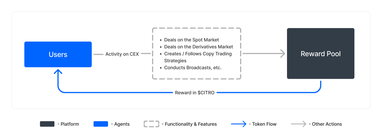 Система вознаграждений для трейдеров основана на активности пользователей, совершающих транзакции на бирже Citronus CEX. Взаимодействуя с платформой, пользователи выполняют следующие действия: